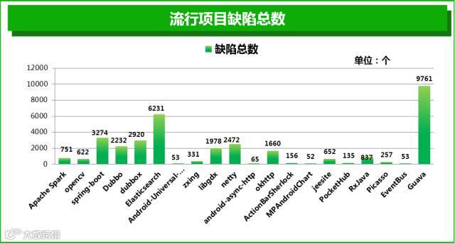 20个流行项目中,Guava项目检出的安全缺陷数量最多,Guava是Google 的一个开源项目,包含许多 Google 核心的 Java 常用库。