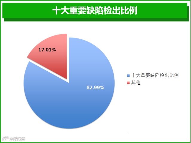 在所有检出缺陷种类中,依据缺陷类型的危害程度、受关注度等因素,选择10类重要缺陷进行检测结果分析,图1是10大重要缺陷统计列表(按检出数量多少排序),图2是10大重要缺陷在2228个项目中出现的比率。