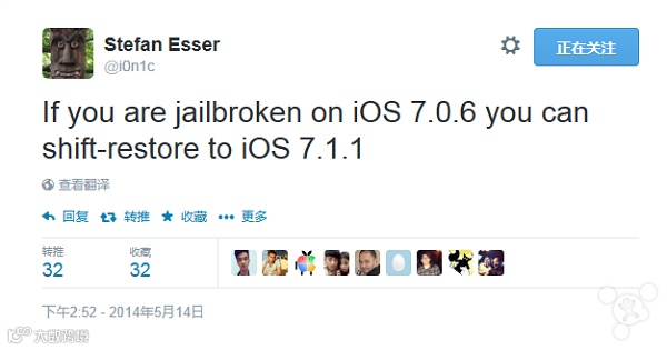 虽然Evad3rs已经有意无意表过态,他们很可能不会发布支持iOS 7.1的越狱工具,但是相信仍然会有不少锋友一直都在盼望着“奇迹”出现。现威锋网了解到,前知名越狱黑客、安全专家i0n1c(也就是我们常说的树人)今天发推表示:如果你是一名iOS 7.0.6越狱用户,可以升级到iOS 7.1.1。