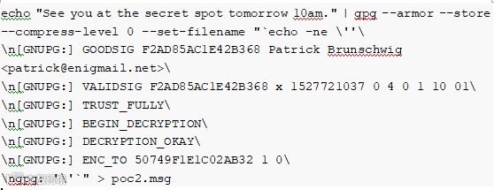这些攻击相对容易执行。Brinkmann 在其中一个 PoC 利用代码中伪造的是Enigmail 开发人员 Patrick Brunschwig 的数字签名,如下: