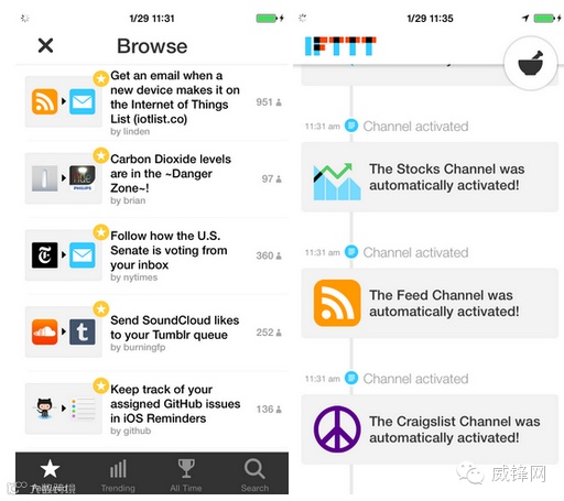 今天给大家介绍一款非常能体现现代互联价值的iOS应用《IFTTT》,这是国外一个互联网服务IFTTT在iOS平台上推出的App,宗旨就是“让互联网为你工作”。IFTTT是“if this then that”的缩写,意指“如果发生了这件事,则执行另一件事。”,也就是让你的网络行为引发连锁反应,将各种信息串联起来,然后再集中把你要的信息呈现出来。