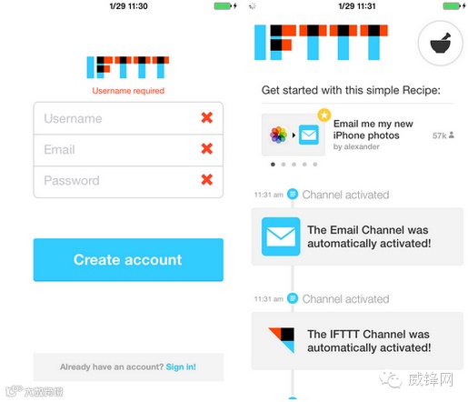 如果是平台服务性质的Trigger,比如Instagram或者《印象笔记》这些,则需要先授权才能支持。随后我们设定then引导的“反应”,也就是Recipe,例如发送邮件或者保存到云端。如图所示形成了一段语句“如果拍摄了一张新照片就发送一封邮件(到用户注册的邮箱)”。如此,当小编拍了一张新照片,就会很快收到一封邮件,邮件上说:你丫拍了一张新的照片。《IFTTT》的iPhone版还增加了支持对手机相册、通讯录、提醒事项的触发操作,比如对新添加的联系人发送“Nice meeting you”的邮件;将完成的提醒任务同步到Jawbone UP feed中。