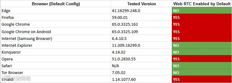尽管如此,浏览器并未禁用 WebRTC,而且几乎在所有主流浏览器中该功能仍然被启用,除了 Tor、Edge 和 IE 浏览器外。