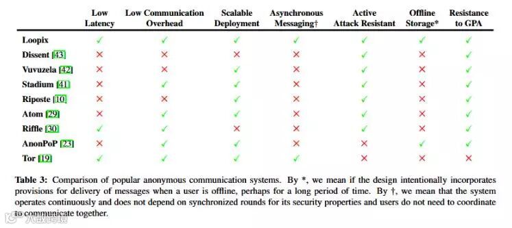 实际上,由研究团队提供的一个比对表显示,Loopix不仅比肩Tor,而且还非常适用于匿名通信,即使跟其它系统如HORNET、Dissent、Vuvuzela、Stadium、Riposte、Atom、Riffle或AnonPoP比对后也是如此。