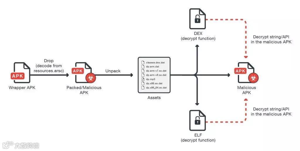 GhostCtrl对应的安卓应用程序APK会伪装成一款合法的安卓app如WhatsApp、MMS等吸引用户。当启用这个APK时,它会从资源文件中解密文本,将这个字符串写为另外一个APK,然后启用恶意APK提示用户安装。之后它不会显示任何图标,而是在后台静默运行,联系互联网上的命令和控制服务器来判断下一步动作。根据受感染的目标和恶意人员的动机,GhostCtrl恶意软件可被用于多种恶意活动中。如果受感染手机仅被受害者在家使用,那么可能会出现勒索软件的行为。然而,由于GhostCtrl跟RETADUP相关联,那么恶意人员就会感染企业网络牟取更多利益。