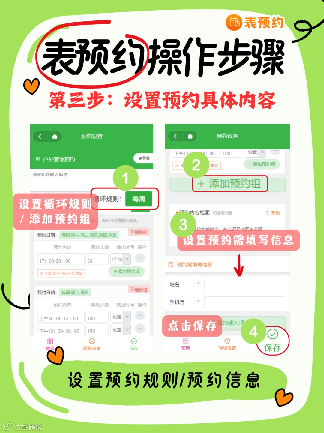 3、设置循环规则、添加预约组。设置预约时需填写的信息,点击保存即可完成创建。「如何实现周期性循环预约?」