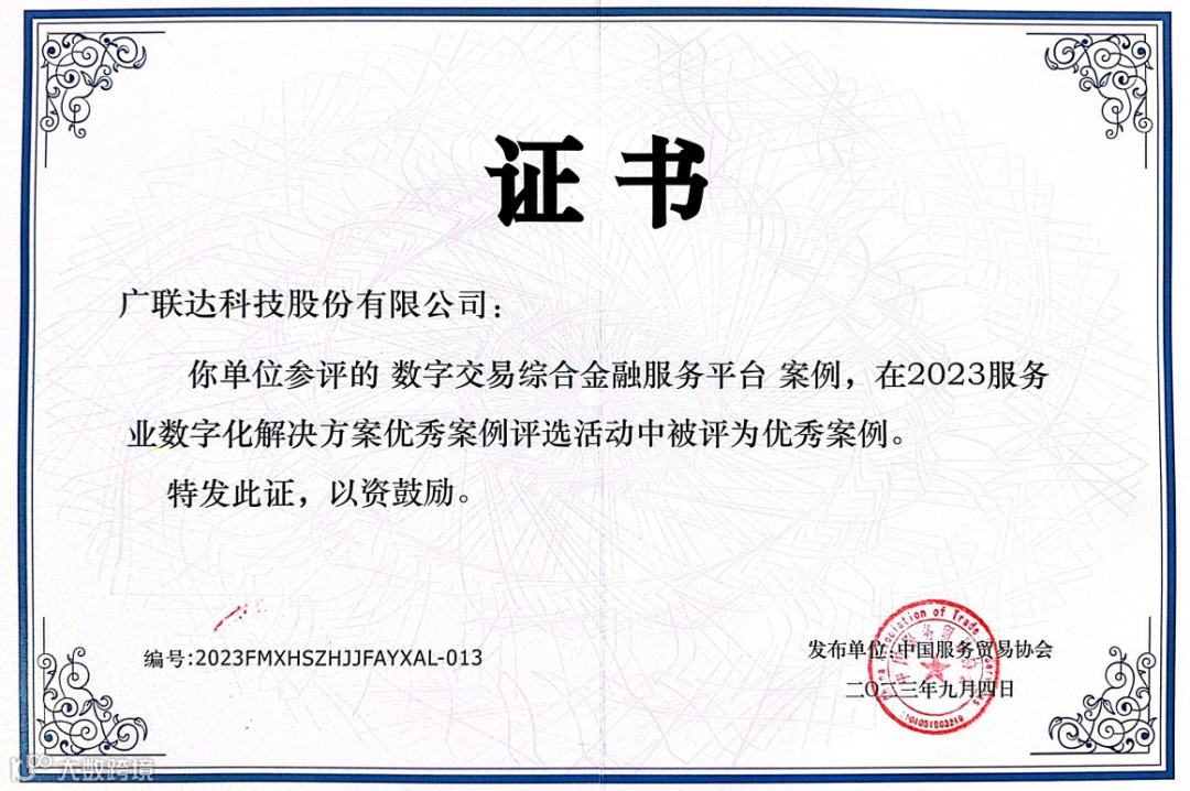9月4日, 2023年中国国际服务贸易交易会(以下简称服贸会)第六届“一带一路”服务贸易合作高峰论坛在京圆满举办。凭借先进的技术创新及广泛的行业应用,广联达数字交易综合金融服务平台获评中国服务贸易协会“2023服务业数字化解决方案优秀案例”,代表着行业对广联达践行数字建筑理念的认可。