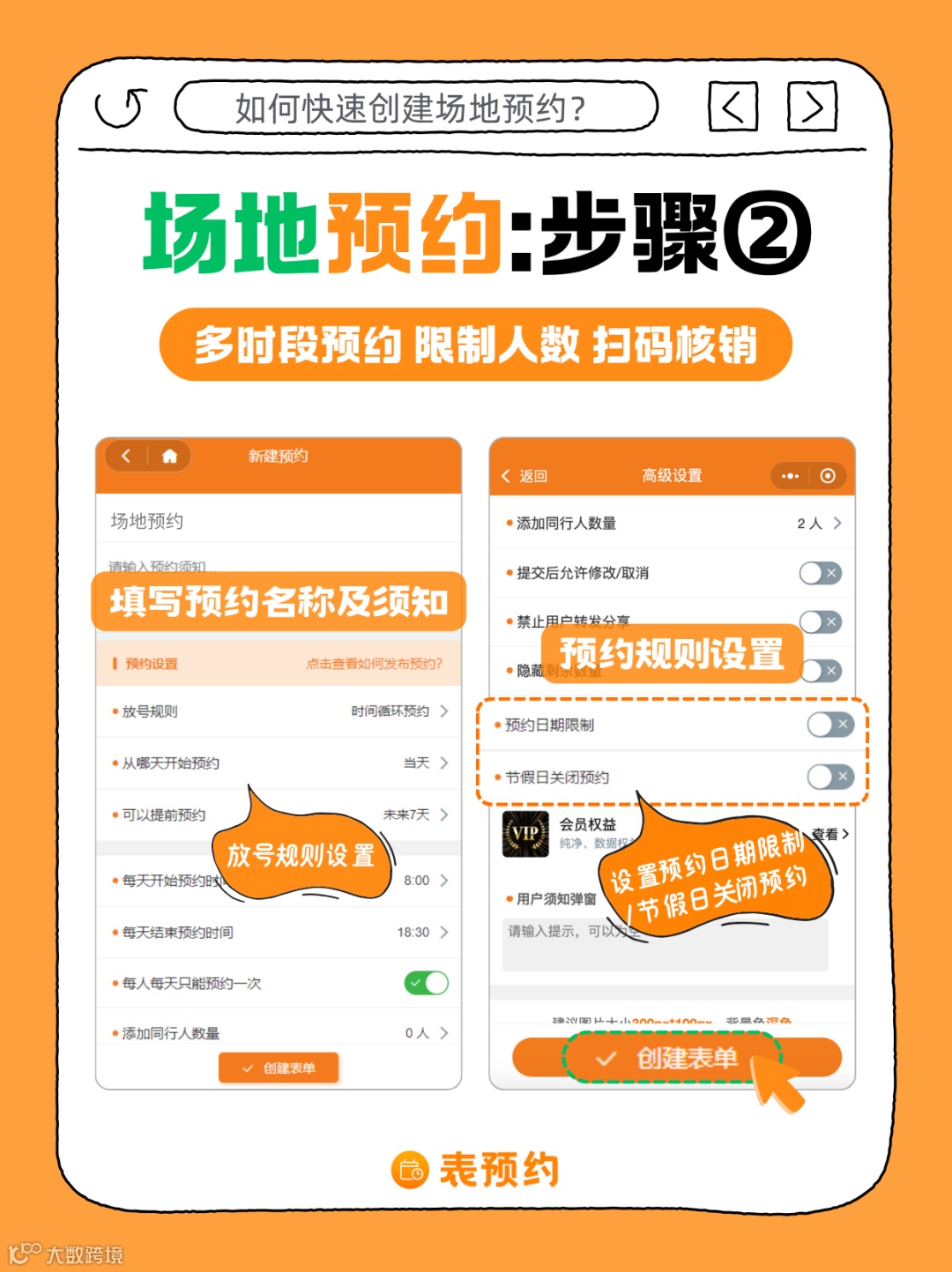 进入小程序后点“新建预约”,输入预约名称如“场地预约”,简单写几句预约须知。要不要允许重复预约、能不能修改/取消,这些规则都能直接勾选,设置完点“创建表单”。