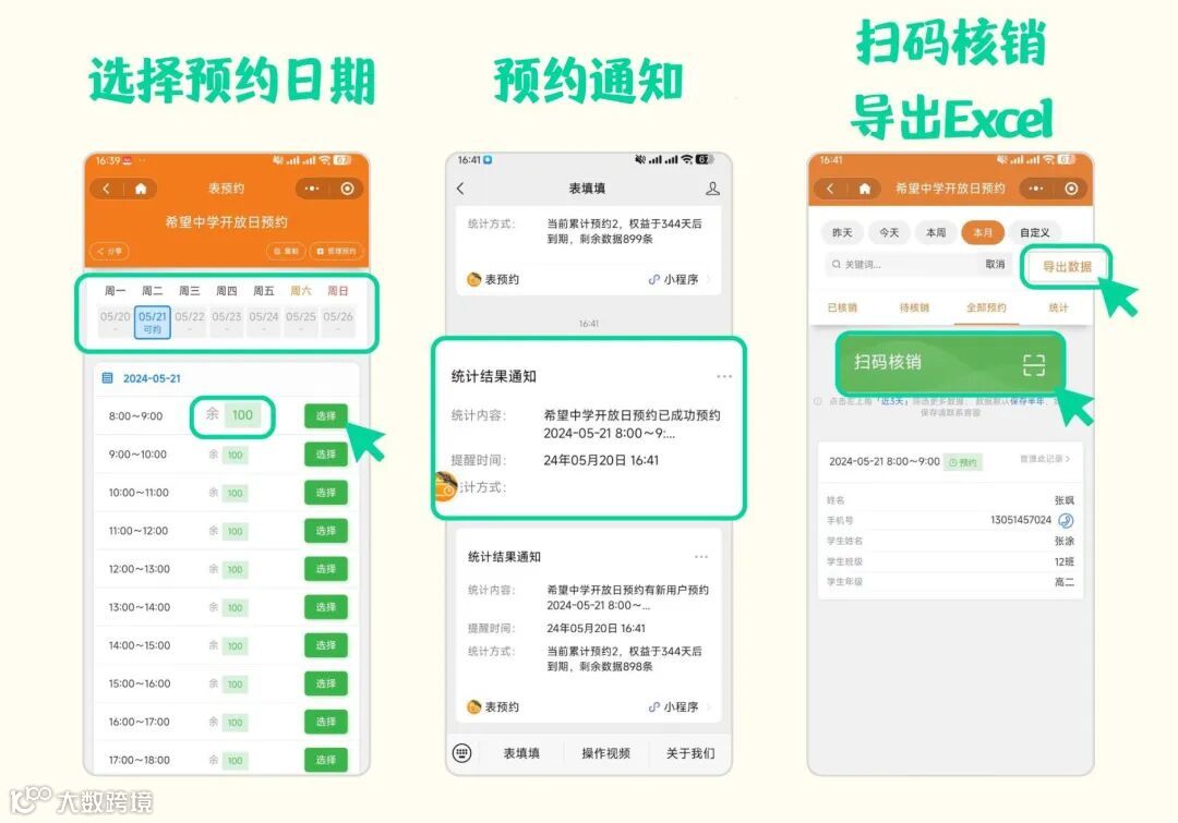 家长通过学校公众号或者多种扫码方式进入预约页面,选择开放日的预约时间,填写信息后,提交生成核销二维码。此时学校管理人员会收到预约通知,到开放日当天,支持授权管理,让门卫有扫码核销的权限。支持一键导出Excel,方便统计预约人员数据信息。