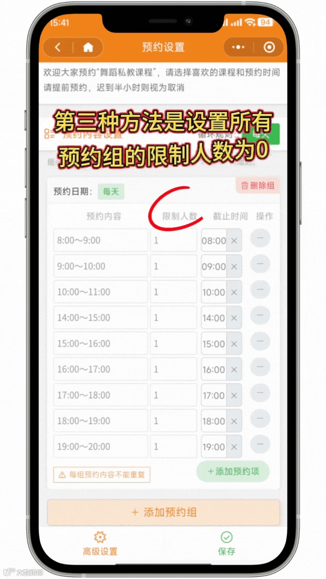 进入设置后,需要把每个预约组内的所有“限制人数”,设置为0,这样用户进入预约页面的时候,能看到预约内容,但是每个时间预约内容的预约名额都是已满。(此种方法适用于临时关闭其中的某个预约,单独设置其中一个预约内容的限制人数为0)