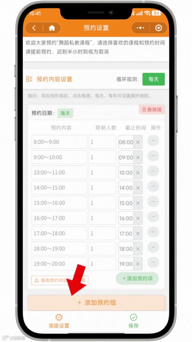 设置每天开始预约时间为8点,那么结束预约时间设置为8点之前,这样用户进入预约页面的时间,会显示不在预约时间范围之内。