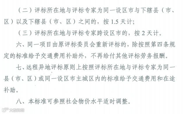 (二)评标评审所在地与专家所在地不为同一县(市、区)的,按往返每公里1元标准计算交通费,公里数按合法地图中的合理里程计算。