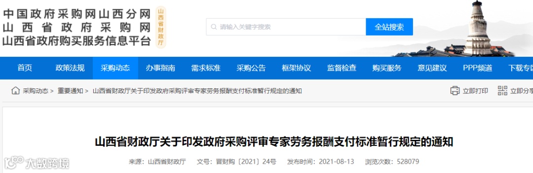 《山西省财政厅关于印发政府采购评审专家劳务报酬支付标准暂行规定的通知》(晋财购〔2021〕24号)