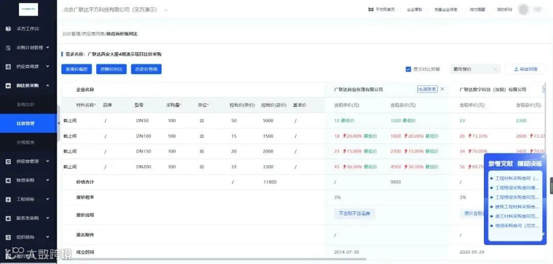 a、询比价报价自动汇总:供应商每轮报价自动汇总,可查看价格来源;线下报价可以在线导入,形成线上价格库;历史价格库可在比价过程中进行查询,辅助价格对比筛选;采购过程报价数据,可供成本/预算等部门协同应用。