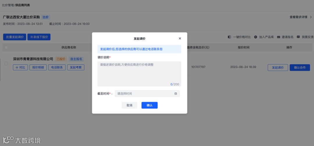 b、在线发起调价:可在线发起多轮次供应商调价,调价结果多轮对比,筛选最优报价供应商,且全过程数据在线留痕,方便审计;