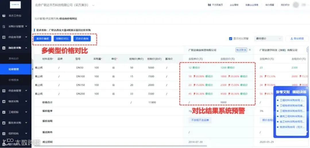 a、多类型价格对比,对比结果系统预警:根据对比类型,系统自动预警超出比例 ,合理范围价格/最低价显示,辅助价格对比谈判。