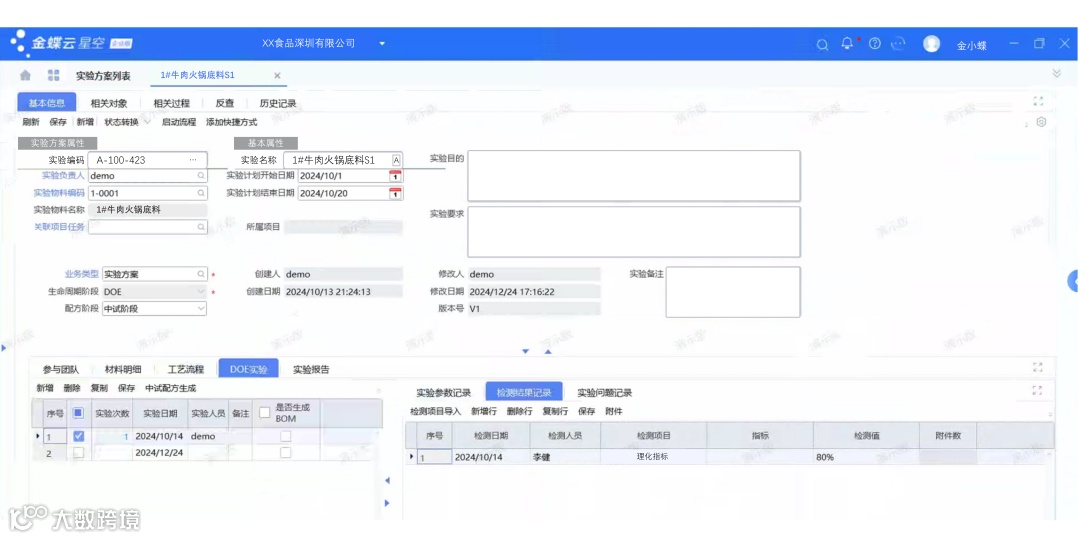 在金蝶云·星空PLM系统实验数据通常通过实验单来记录,主要包括:实验材料、实验工艺、检测指标、实验分组情况、实验分析、审批流程记录等信息在实验开发各个环节的实时录入。通过对实验数据的规范管理和系统录入,构建企业的产品数据经验库,防止重复性的实验开发测试。不仅如此,在开发新产品时,在实验数据库可以通过对产品实验数据的统计分析,预测新产品的实验结果。也可以根据影响实验关键因素的数量和水平,选择全因子或者部分因子、应面设计等自动设计实验方案矩阵。