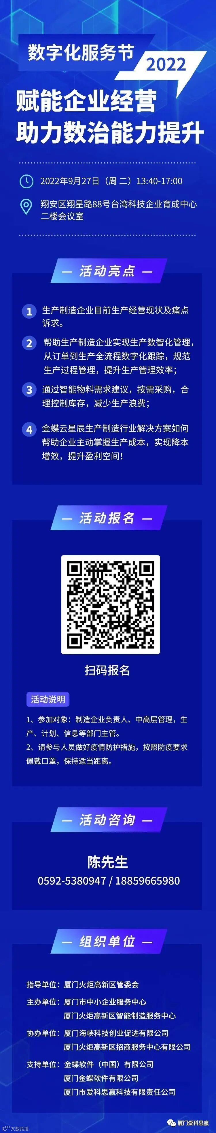本期活动中小企业服务中心联合火炬高新区智能制造平台服务商爱科思赢(金蝶软件本地服务商),共同举办“赋能企业经营,助力数治能力提升”主题活动,特邀金蝶资深顾问专家分享数字化转型见解,解读转型标杆案例,演示金蝶数字化赋能工具,期待给您带来一场企业管理升级的思考和启发!本期活动具体事项通知如下。