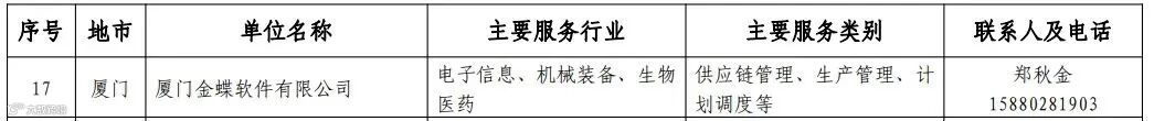 2023年11月13日,福建省工业和信息化厅公布了福建省产业数字化服务商(第一批)名单,厦门金蝶成功入选,将为电子信息、机械装备、生物医药产业数字化转型提供服务并赋能。