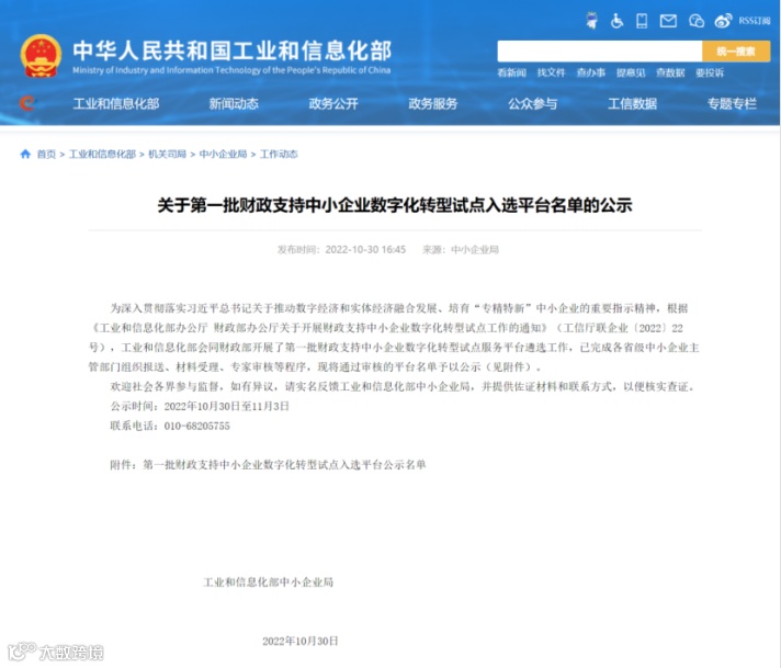 工信部:第一批财政支持中小企业数字化转型试点服务平台