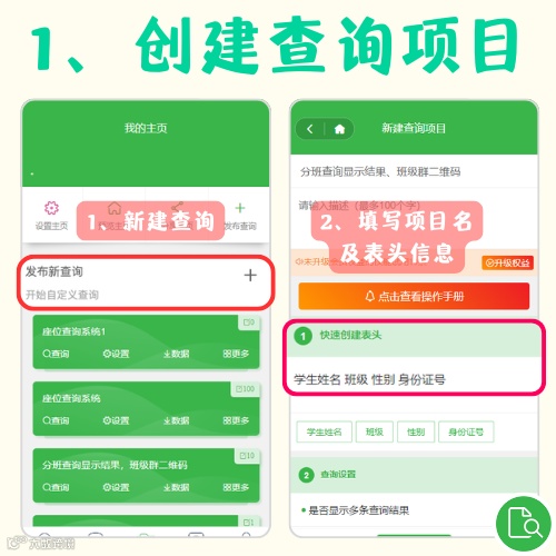 打开“表查查”小程序,点击【创建项目】,设置项目标题,比如“2025届毕业证书查询”或“线下活动报名名单查询”。接着添加字段:姓名、手机号、证书编号等等,