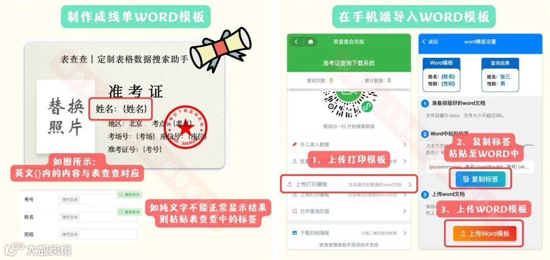 获取项目生成的标签,把标签粘贴到Word模板对应位置,上传模板,查询时会自动按每个人数据映射出来,生成PDF
