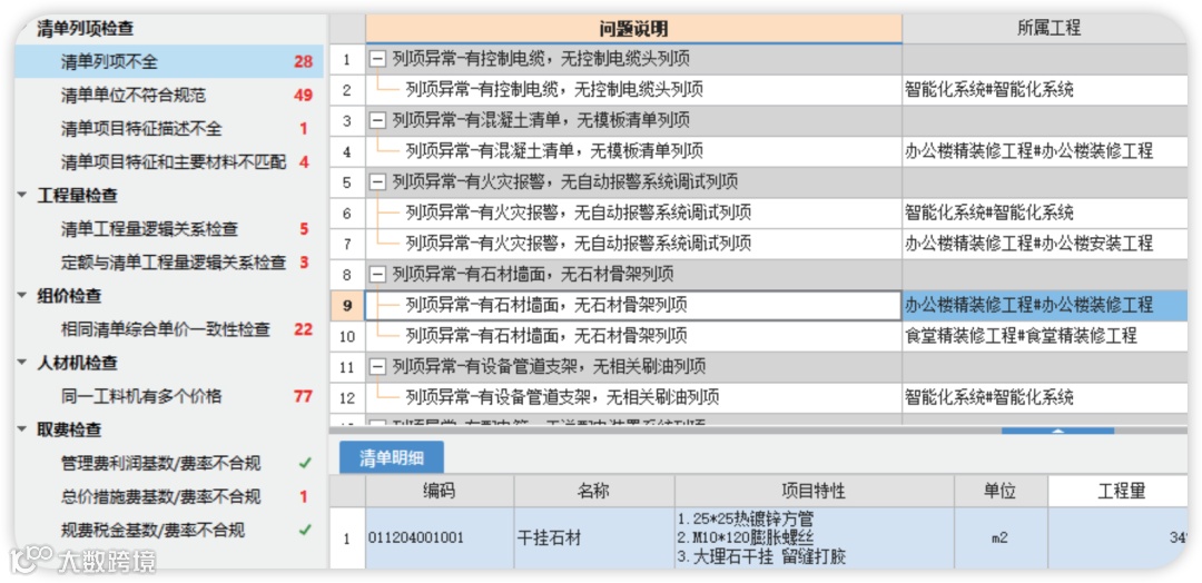 清单缺漏项、清单特征描述不全、清单工程量正确性、定额工程量正确性、材料与特征描述不符、材料价格合理性等均可智能检出。