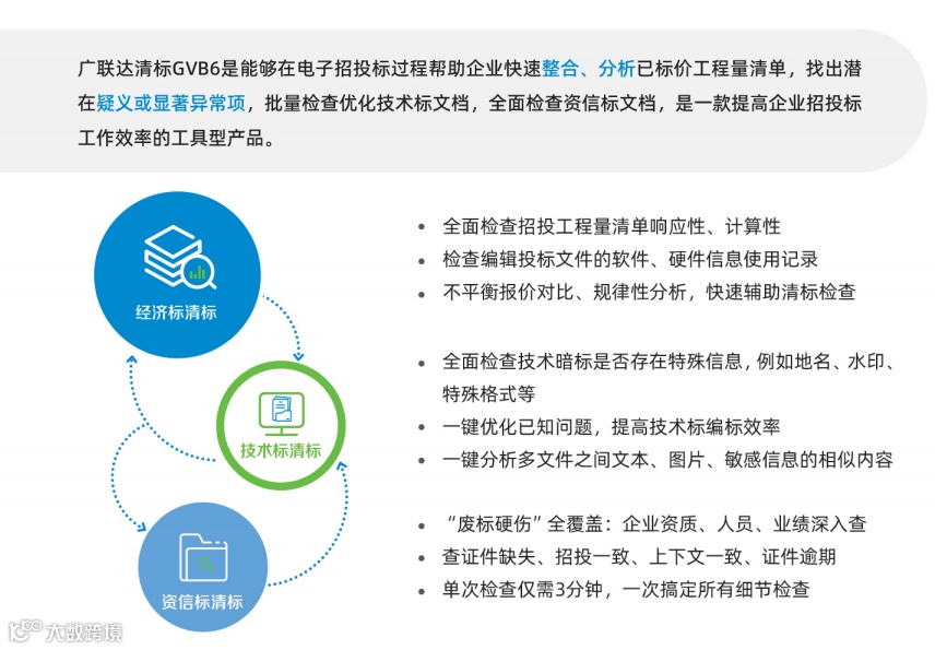 基于以上的检查要求及现状,广联达清标可以为各单位提供全面覆盖招标文件要求的清标规则、从合规性、合法性、响应性和合理性多角度精准识别投标文件的潜在风险、高效整合呈现清标报告, 辅助标书检查提效。