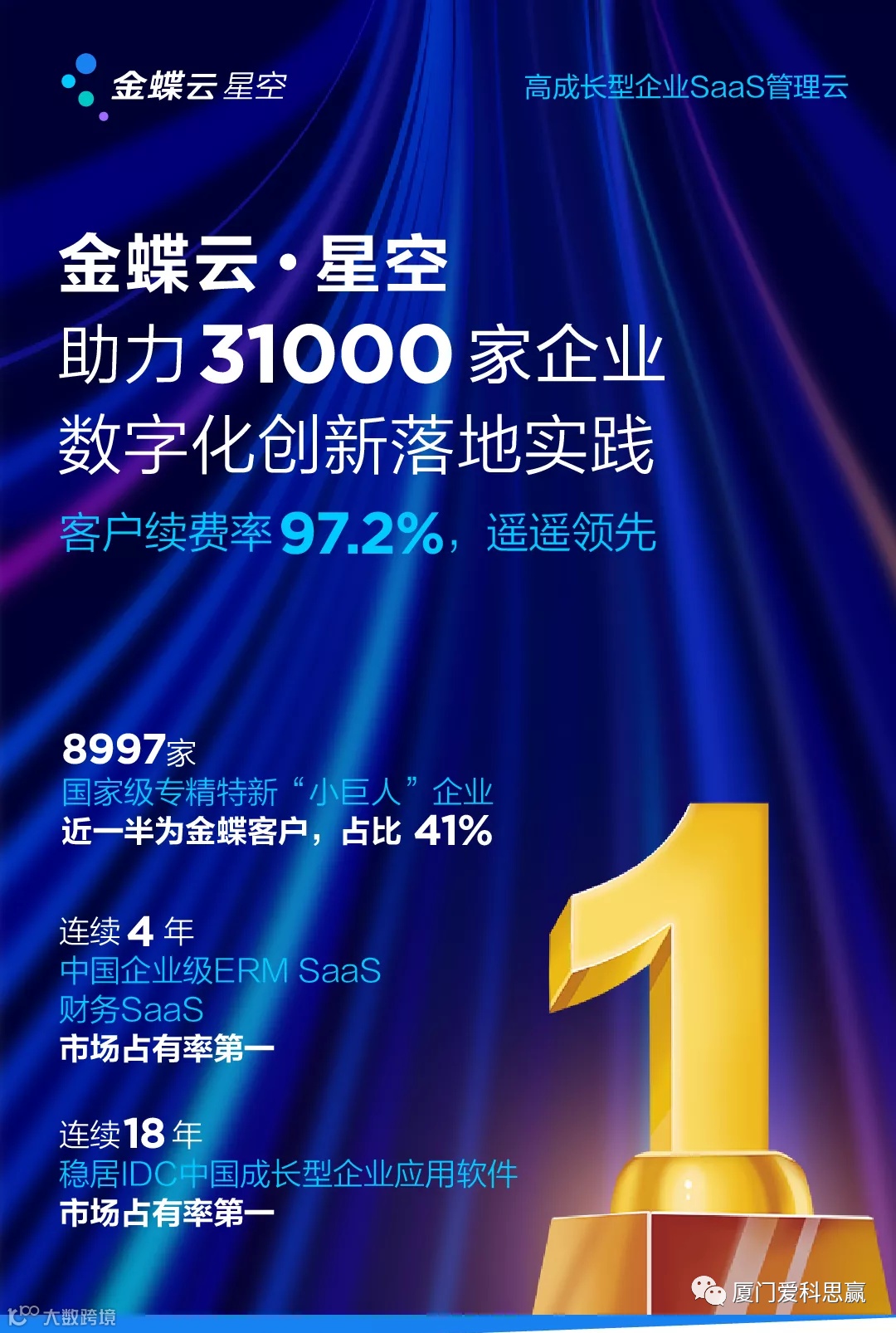 金蝶云·星空,高成长型企业SaaS市场领导者,市场份额及客户满意度遥遥领先,连续17年稳居IDC中国成长型企业应用软件市场占有率第一,并入选2021年度国家中小企业公共服务示范平台。 金蝶云·星空基于领先的可组装低代码PaaS平台,全面服务客户研发、生产、营销、供应链、财务等领域转型,已支持IPD、精益、阿米巴等先进管理理念在2.8万余家客户实践,一起助力企业“产品力、获客力、交付力、口碑力、收益力”全面提升,重构企业数字战斗力。
