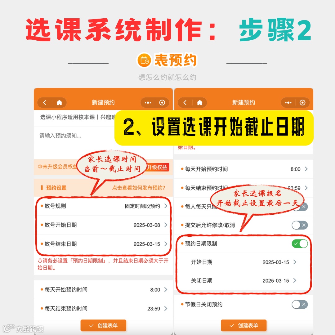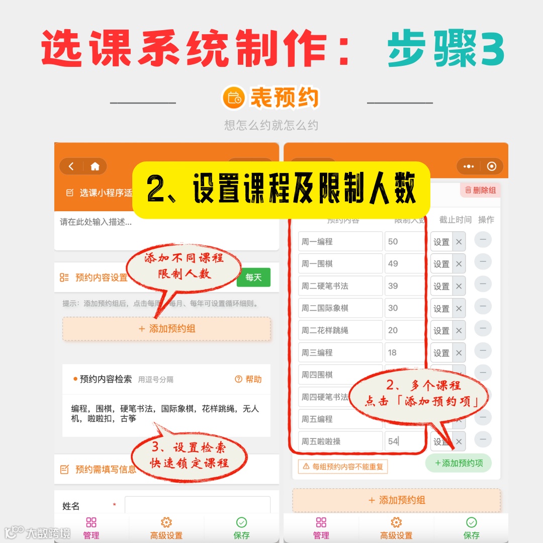 3.教师可以自由设置课程信息和人数要求,如(篮球,足球,书法,跳绳,古筝,国际象棋,五子棋等) 4.老师可以在表预约内填写学生信息,如(班级,学号,学生姓名,家长手机号等)设置必填项,不填写无法完成选课。