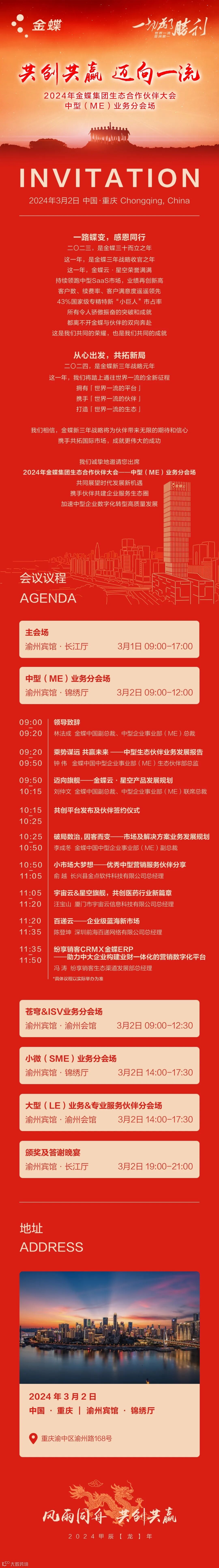 2024年,是金蝶新三年战略元年,这一年,我们将踏上通往世界一流的全新征程,面对新的机遇和挑战,金蝶诚挚地邀请您共绘未来战略蓝图,奔赴一场共创共赢之旅!👉3月1日-2日,2024年金蝶集团生态合作伙伴大会,我们在重庆恭候您的到来!