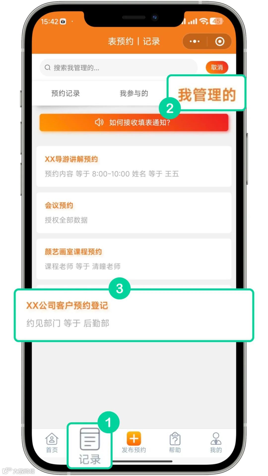 1、进入表预约主页下方选择“记录”,点击“我管理的”,可以查看自己管理的所有预约项,点击需要查询的预约项,即可进入。