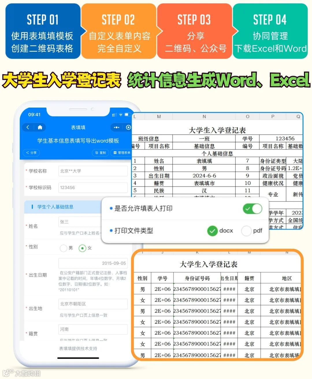 学生扫码填表,可下载Word/PDF文档。填写信息自动汇总,老师一键导出Excel数据,高效完成工作。