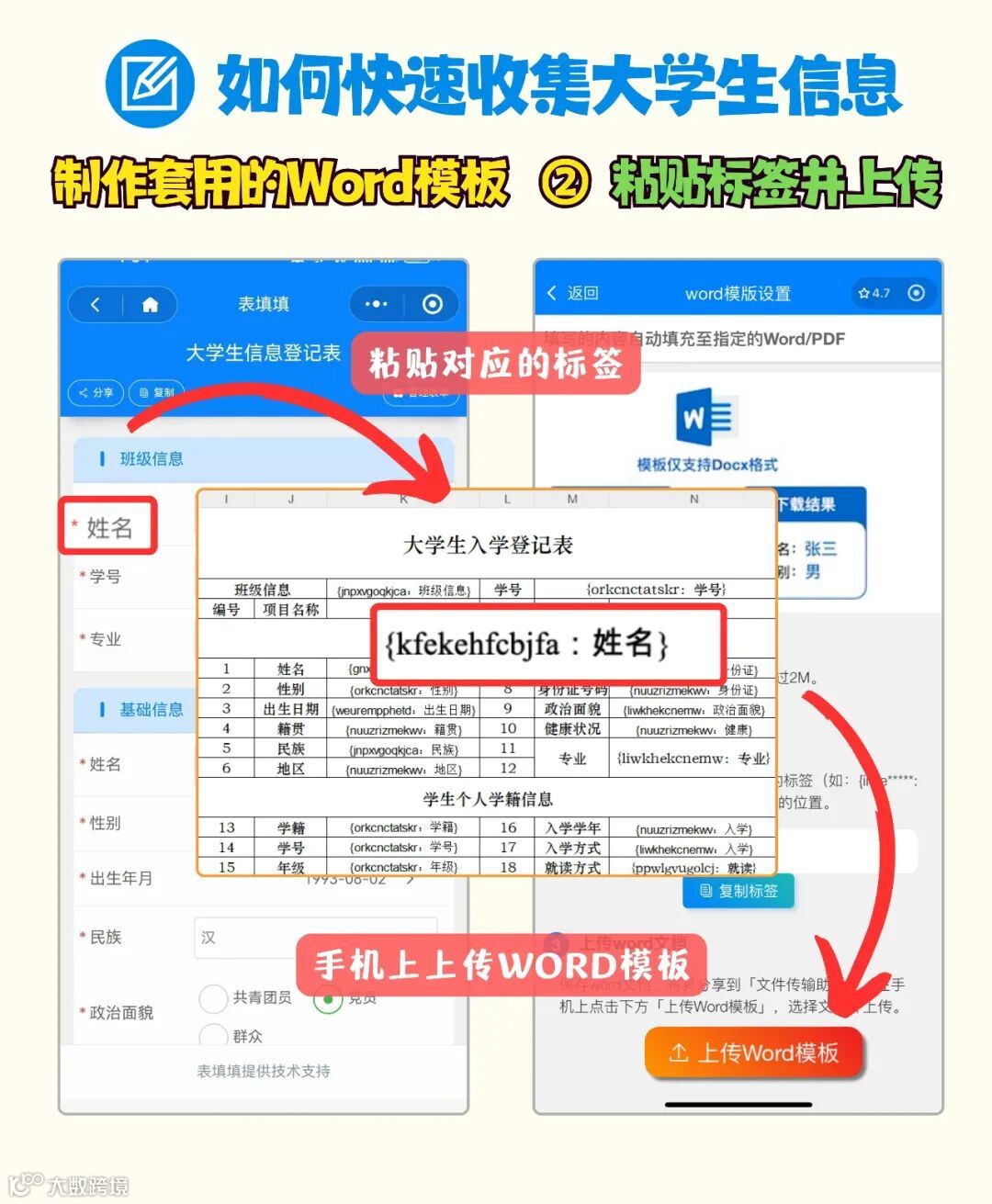 老师在Word上制作套用的模板,复制表填填标签粘贴到Word文档对应位置,手机端上传Word模板。