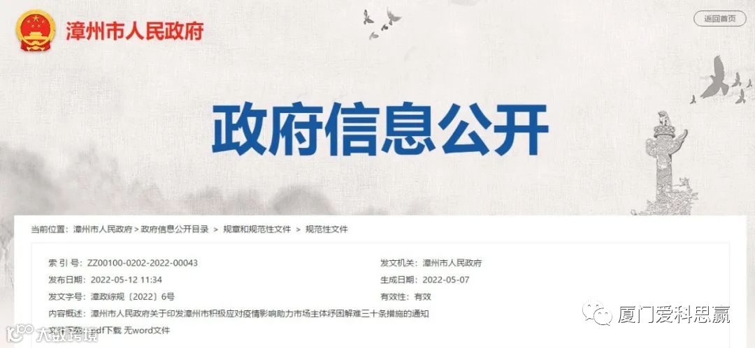 漳州市人民政府关于印发漳州市积极应对疫情影响助力市场主体纾困解难三十条措施的通知--原文链接
