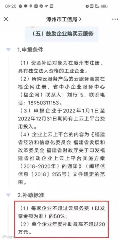 政策重点:鼓励企业购买云服务,对实施数字化、网络化、智能化升级改造的制造业企业,给予其上云费用50%的补助,单个企业最高超过20万元。