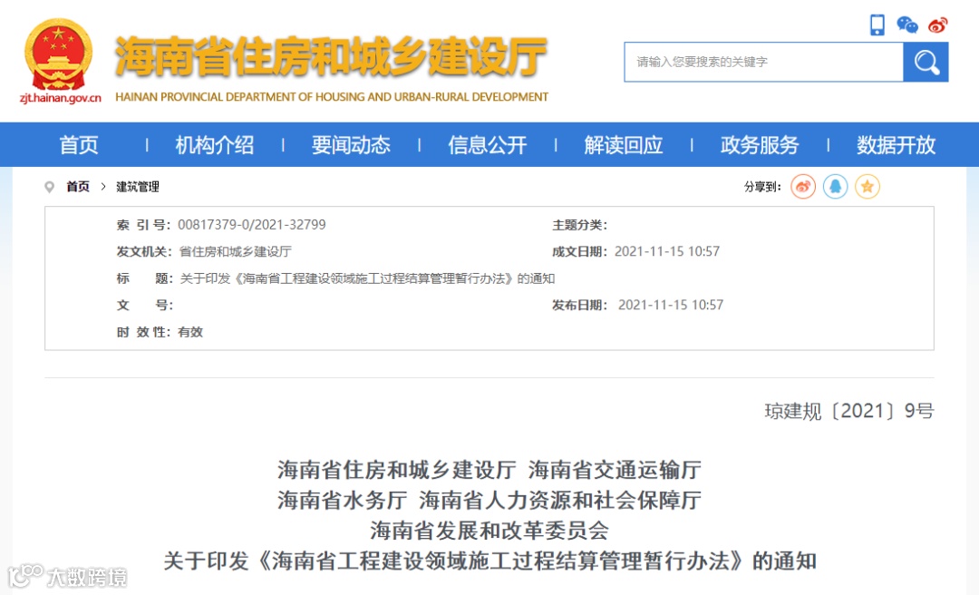 2019年11月,海南省住房和城乡建设厅发布《关于在建筑领域推行施工过程结算的通知》。