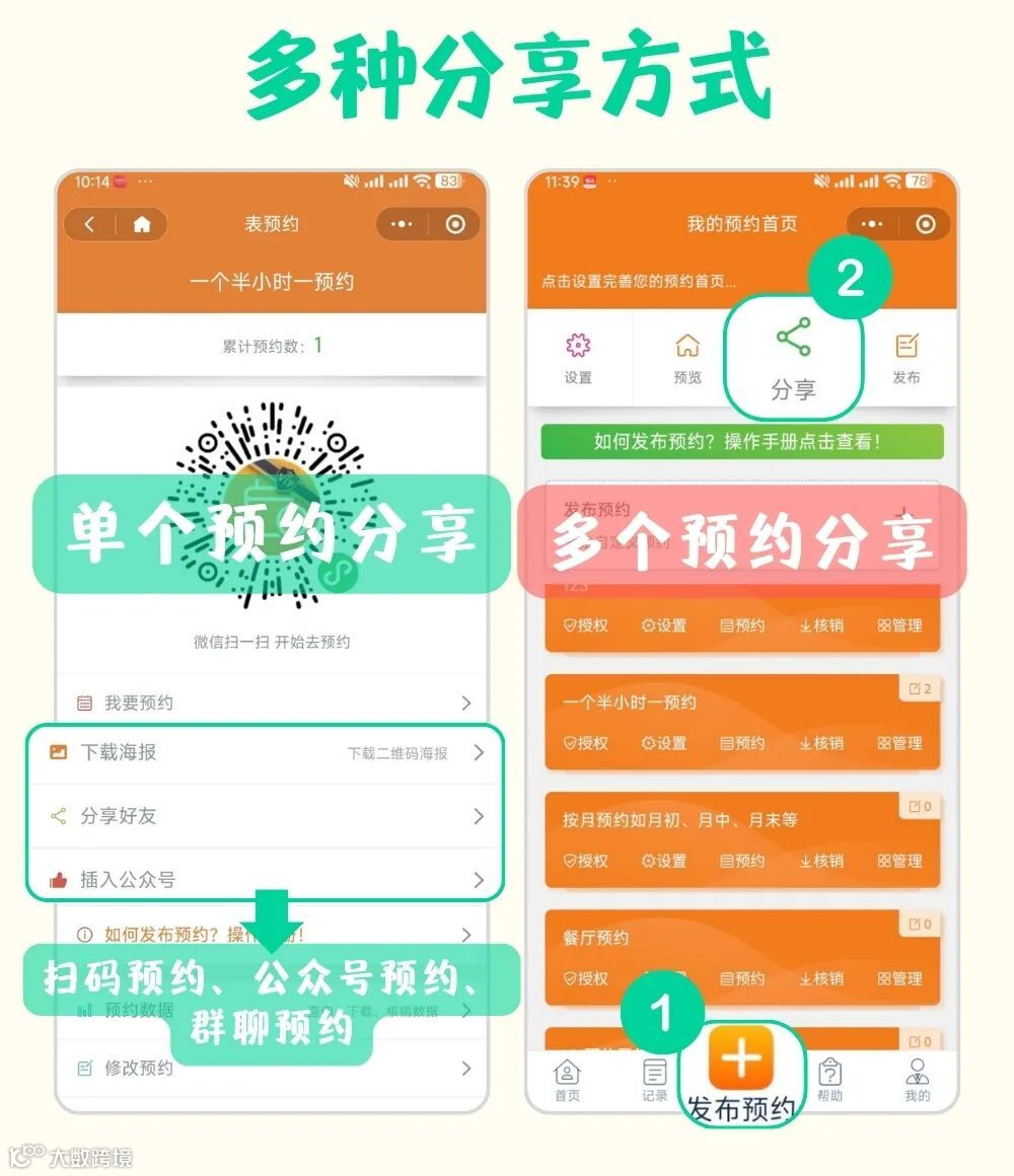 可创建一个预约项,通过下载二维码、嵌入公众号,分享文章、群聊等方式预约,顾客进入后显示预约日期和时间