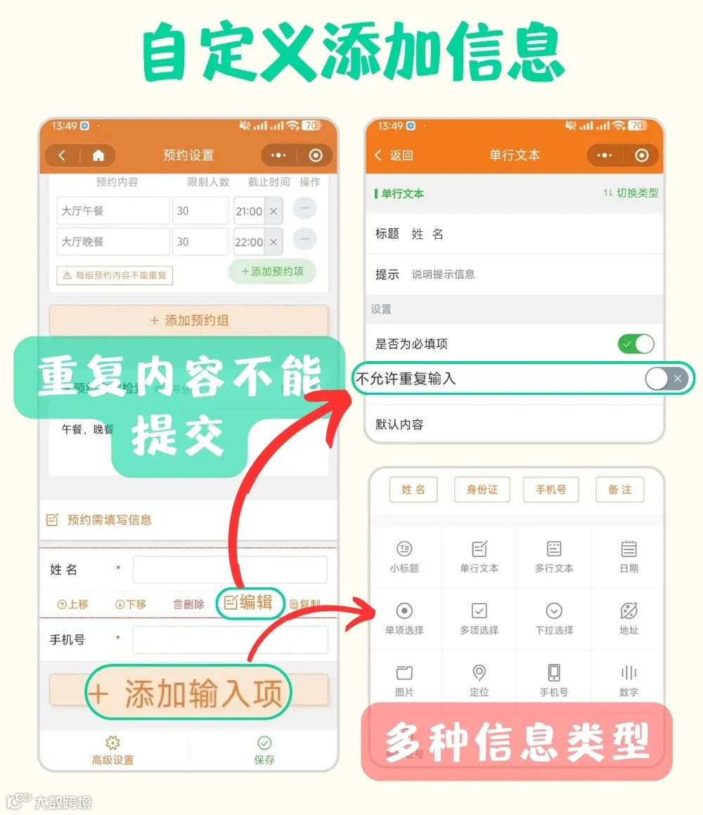 可选择多种类型的填写信息形式(顾客预约时填写的信息),如单选、多选、单行文本、多行文本、下拉框、图片、地址等、并且可以设置这些信息不能重复填写。手机号和身份证号支持自动效验。
