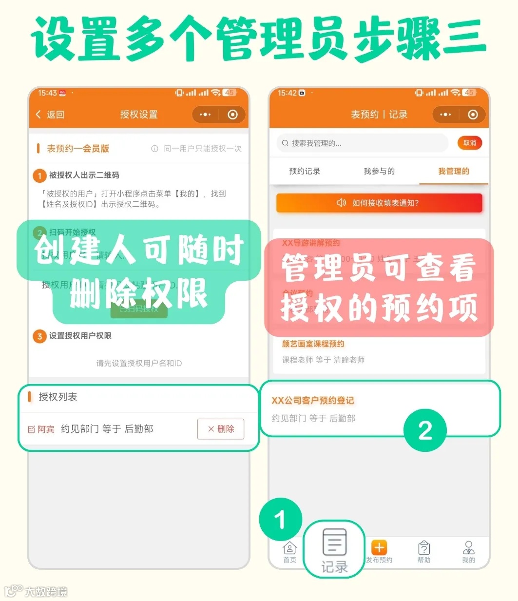 3、创建者可设置管理员,也可以随时删除管理员的权限。管理员可以在主页下方“记录”,选择“我管理的”,可以查看自己管理的预约项