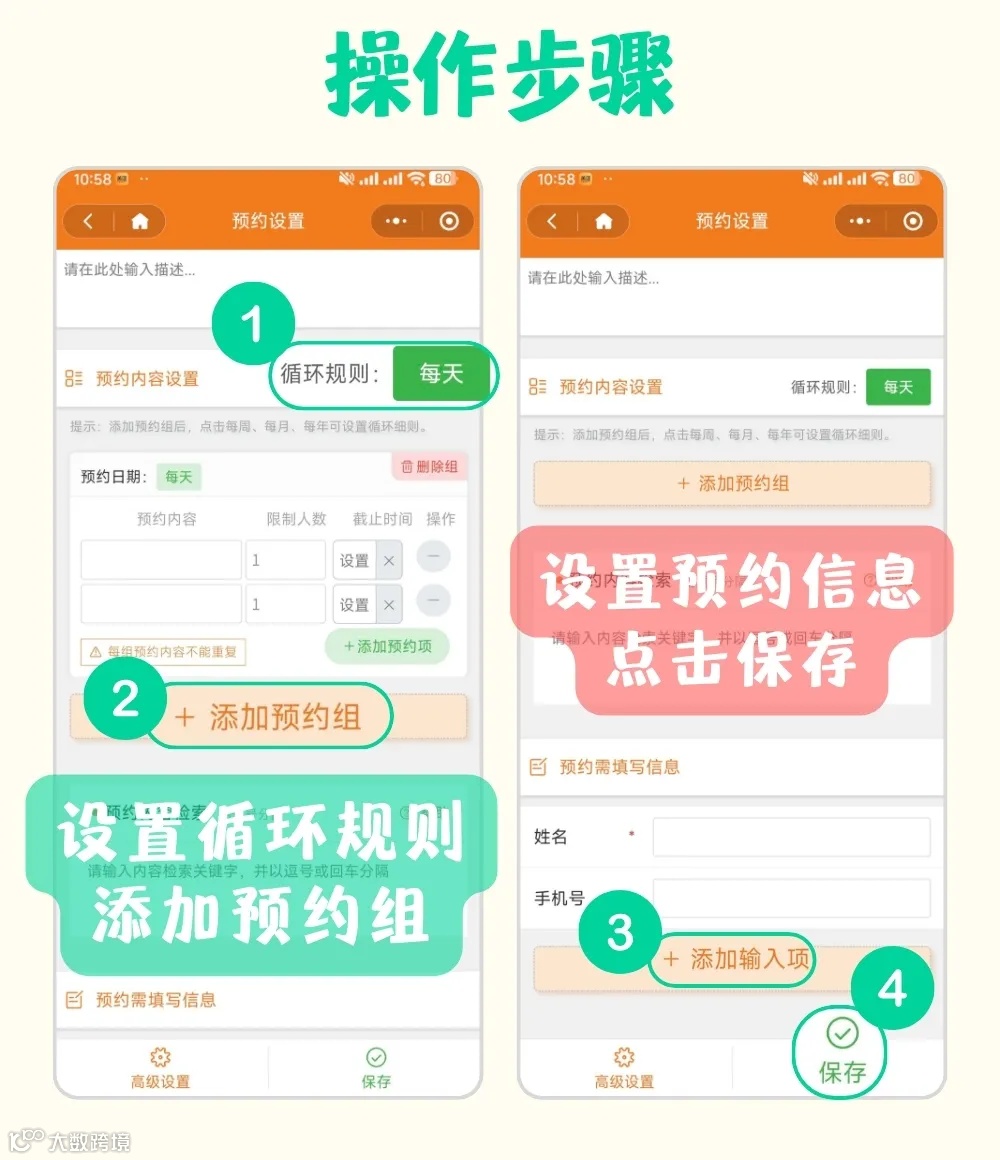 3、先设置循环规则、添加预约组(可自定义预约内容和限制人数),下滑设置预约时学员需填写的信息(填写信息可设置多种类型,信息可以设置不能重复,填写的信息可以设置有效性验证),点击保存即可完成创建