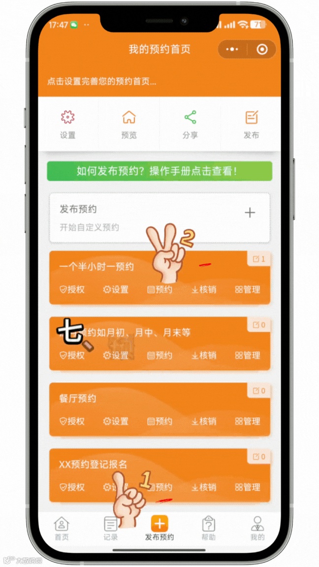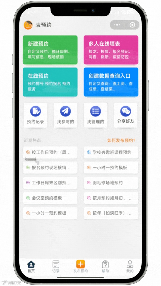 进入「表预约」显示主页面。点击“发布预约”,选择模板或者自定义预约内容。