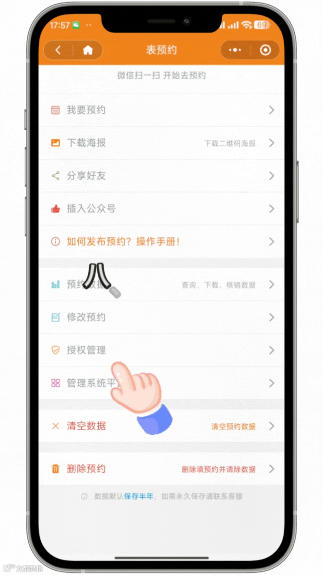 点击「发布预约」中的「核销」,可查看任意时间的预约记录、扫码核销、修改/删除数据,导出Excel数据。注意,此处的日期为预约开始的日期,不是用户什么时候预约的日期。