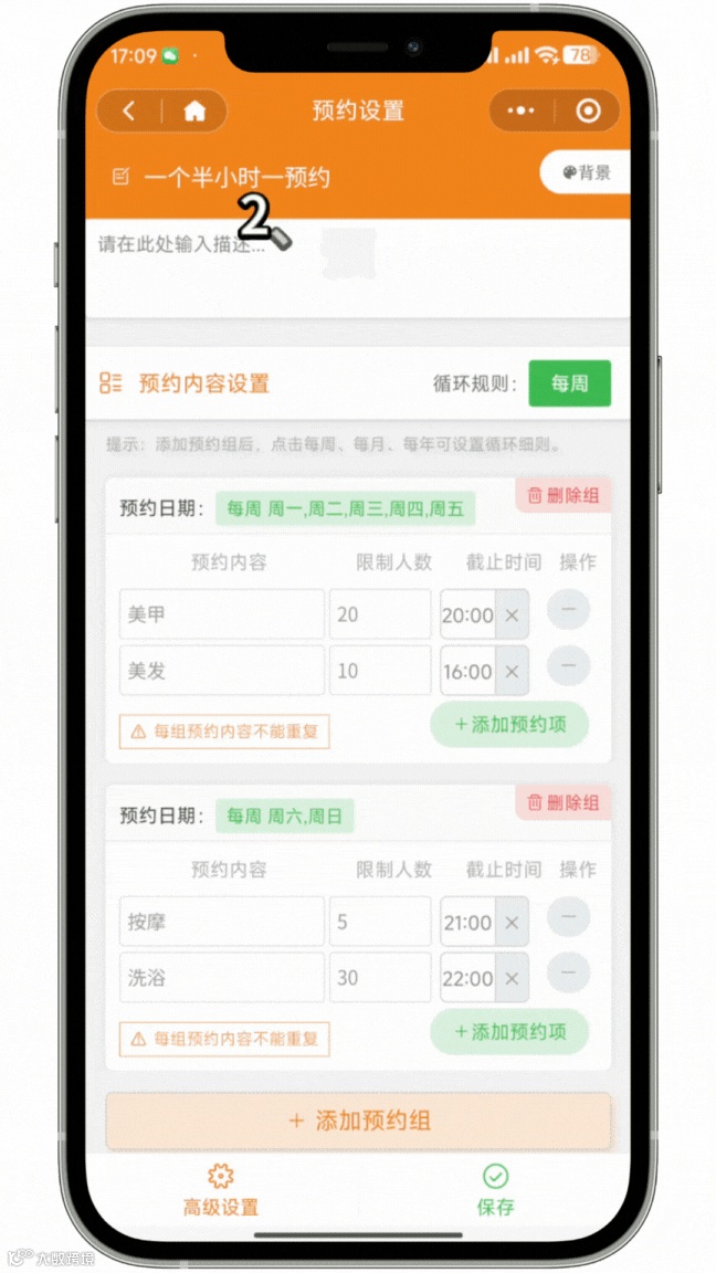 每天开始和结束的预约时间、每人每天预约次数限制,是否可以取消预约,节假日关闭预约等。