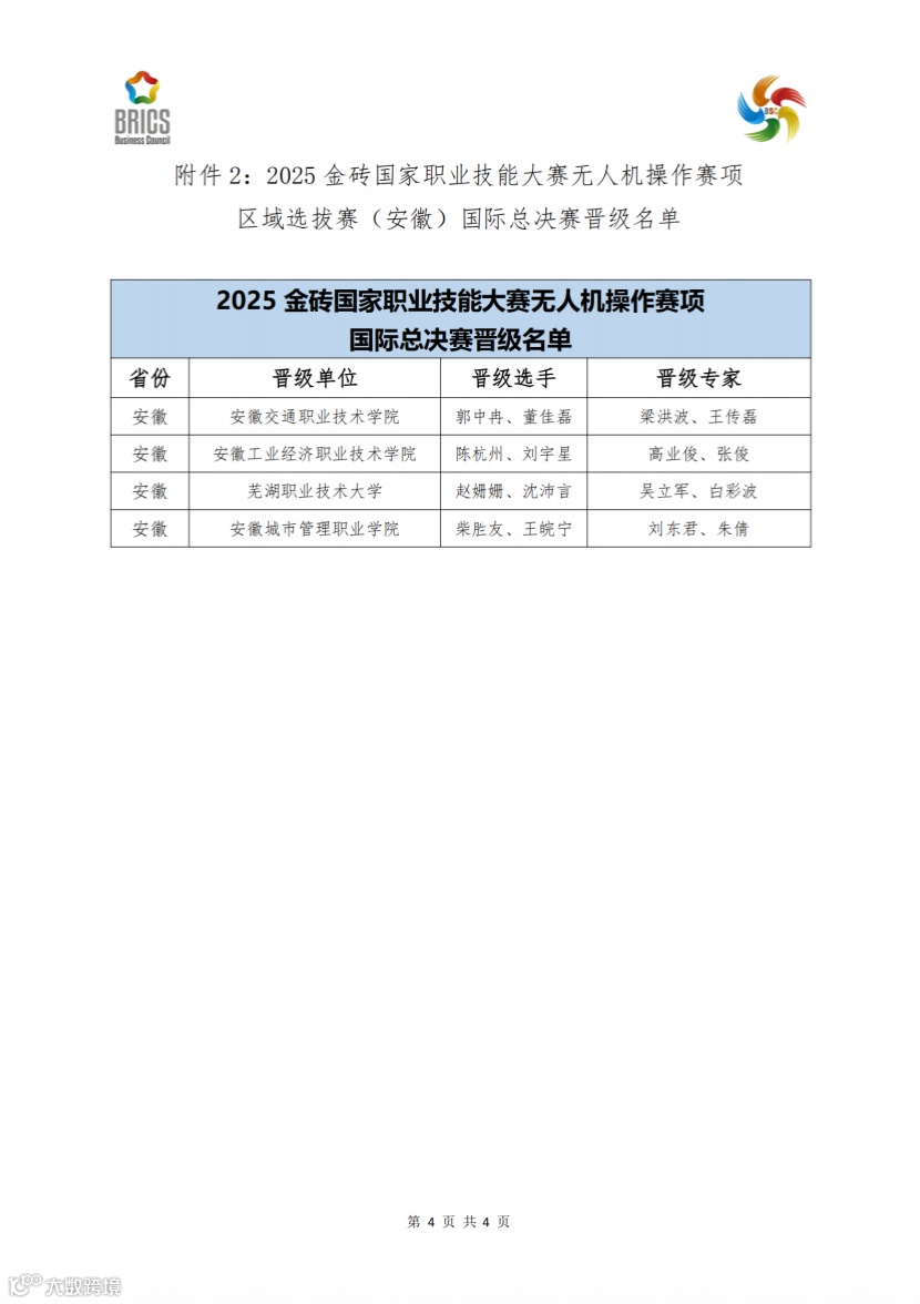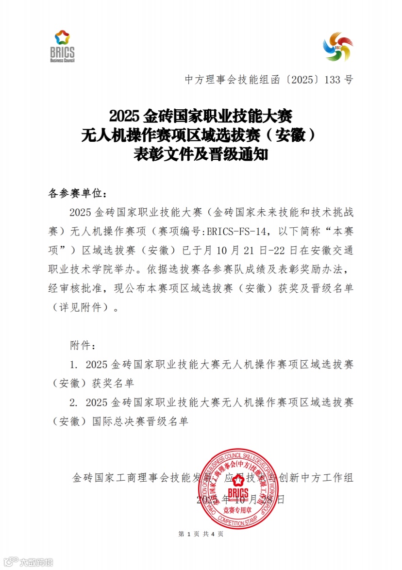 2025 金砖国家职业技能大赛(金砖国家未来技能和技术挑战赛)无人机操作赛项(赛项编号:BRICS-FS-14,以下简称“本赛项”)区域选拔赛(安徽)已于月10月21日-22日在安徽交通职业技术学院举办。依据选拔赛各参赛队成绩及表彰奖励办法,经审核批准,现公布本赛项区域选拔赛(安徽)获奖及晋级名单。