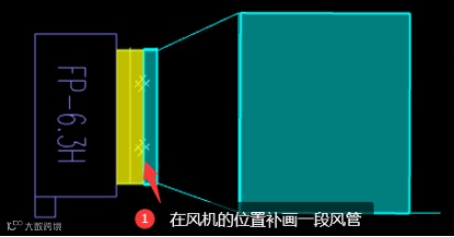 步骤一:在风机连接的位置补画一段风管。如图:(注:天圆地方需要补画一段圆形风管)