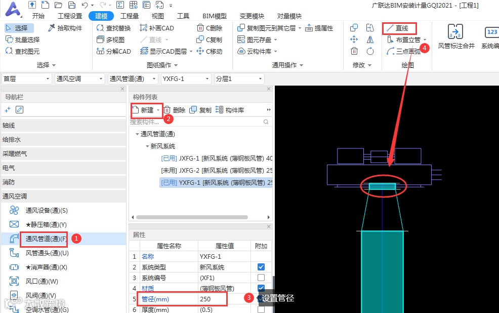 步骤一:点击工具下【测量两点距离】测量一下设备连接位置的风管宽度,然后新建该宽度的风管(圆形/矩形),然后用【直线】绘制一段风管。如图: