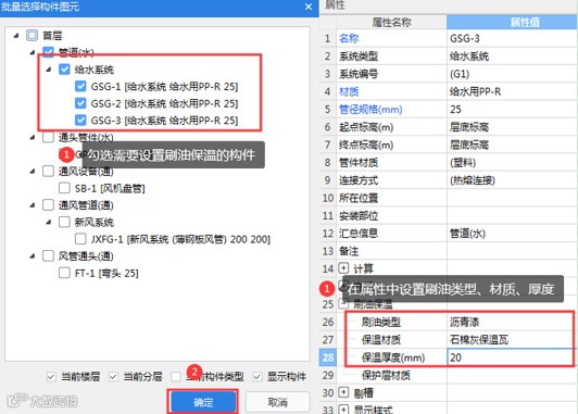 方法:点击【批量选择】(快捷键:f3)功能,在窗口中勾选需要计算刷油保温的管道名称确定,然后在属性中设置刷油类型、保温材质、保护层材质,输入保温厚度,汇总计算完成即可。如图: