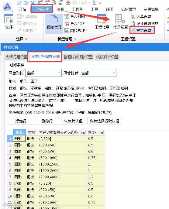 方法一:工程设置---计算设置---其他设置---风管材质厚度设置---支持手动设置。如图: