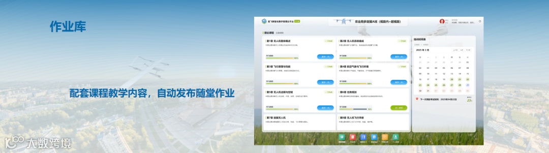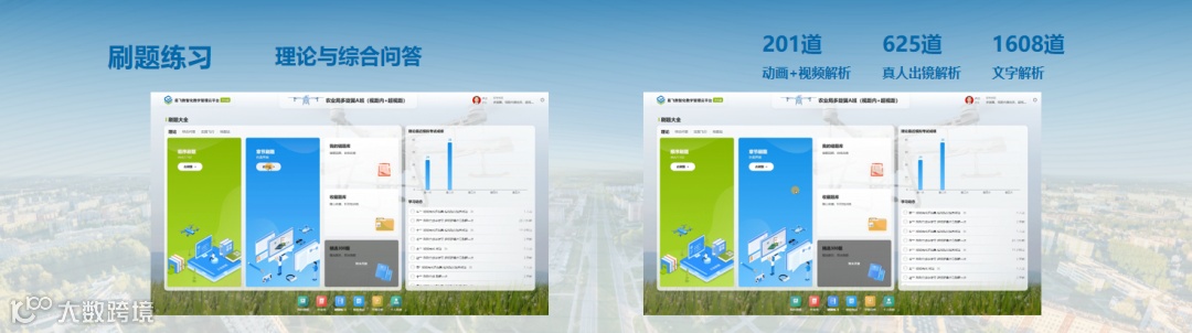 学员端四大科目:理论课程(超视距/视视距内/教员)、综合问答、实践飞行、地面站。科目一理论课程聚焦超视距/视距内,提供9章节体系化内容,含25套PPT课件及手册、18个原理动画、380分钟微课,学员可一键登录并自主学习,精准匹配考证需求。